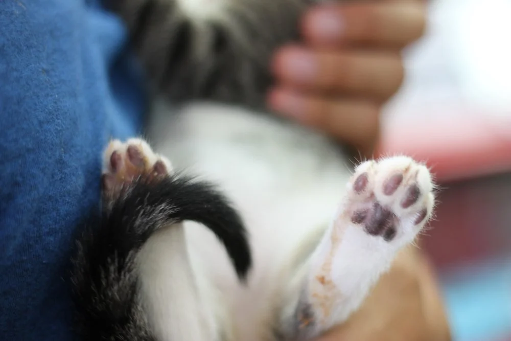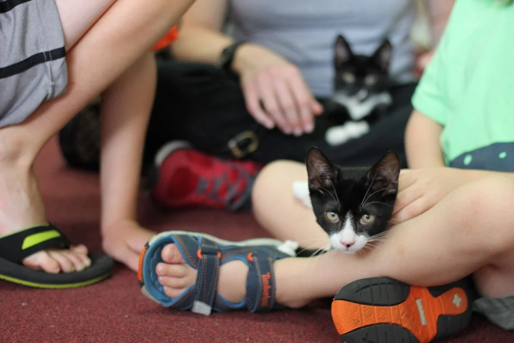 Two tuxedo kittens, Fred and Ethel enjoying their time with a family. They were so patient and sweet with the kids.