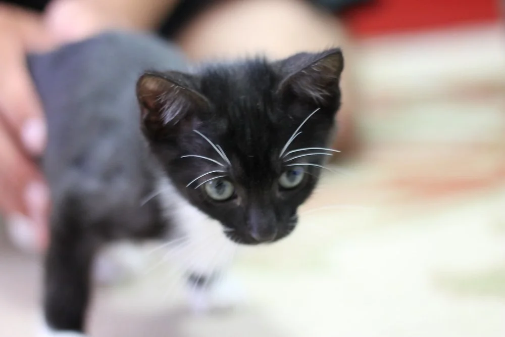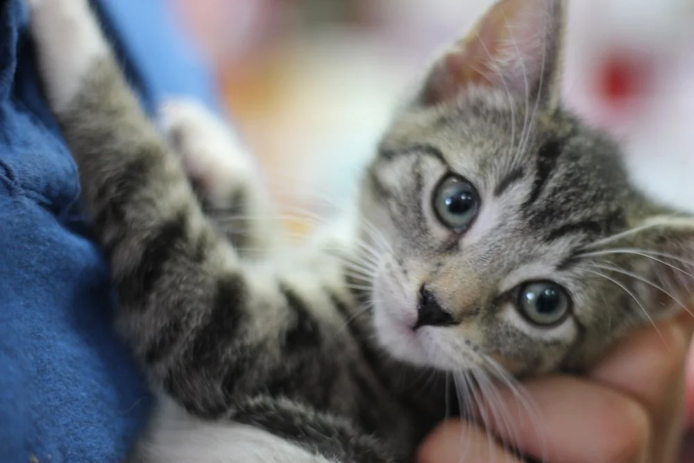 This is Wanda, a lucky kitten that was adopted. Here she is being held by her new family. She will miss her two siblings, Glamour and Smokey, but now have two new sisters and a brother!