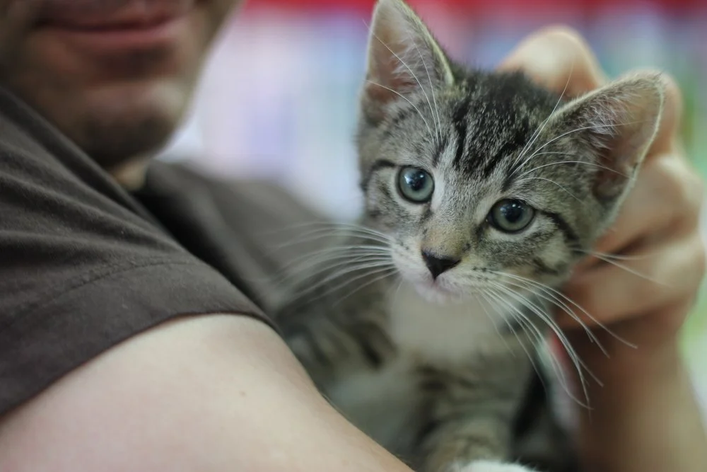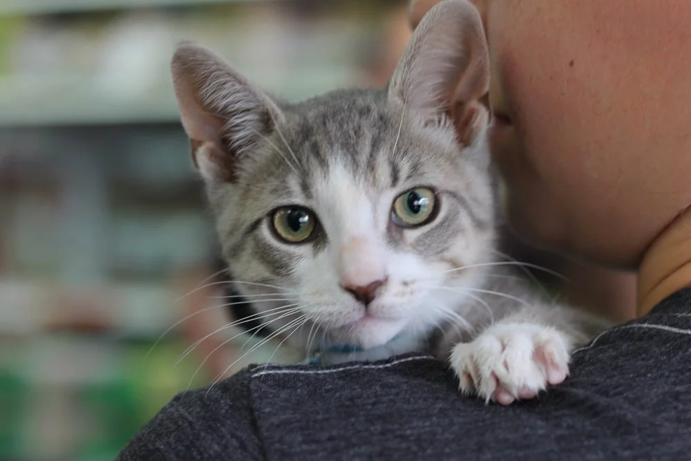 This is Smokey, a sweet kitten that is looking for a home. He is being held by Shawn, who along with Jennifer are guardians of four cats themselves. Looking to become fosters, they might decide to invite Smokey into their home.